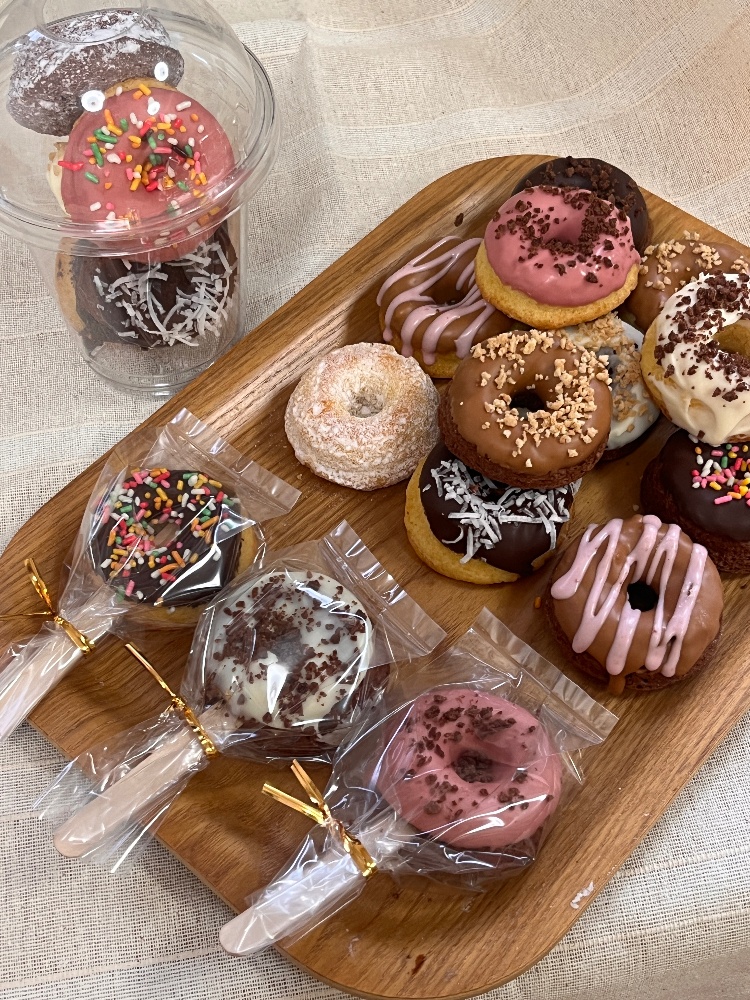 米粉を使ったグルテンフリーのミニドーナツです。油で揚げていない焼きドーナツです。・ドーナツカップ(5個入り) 700円・ミニドーナツバー 150円